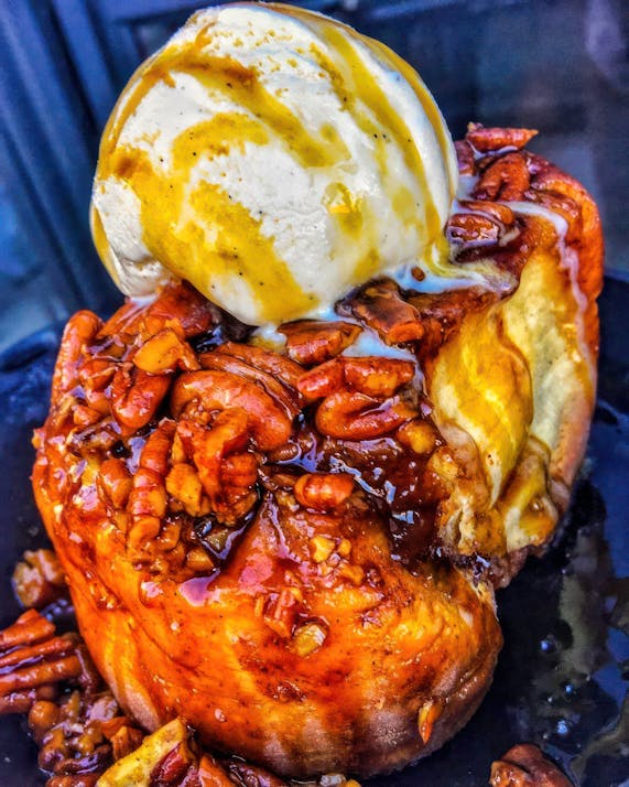 Honey Espresso Sticky Bun with spiced rum caramel, Cold Stone vanilla bean ice cream, and toasted pecans (you better be saying 'pecans' the right way in your heads 🧠)
