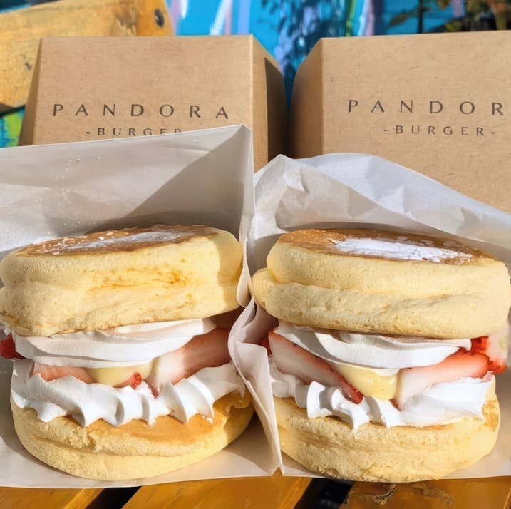 Two fluffy pancake buns, filled with chopped fresh strawberries, two layers of cream and a rich custard center 😋
