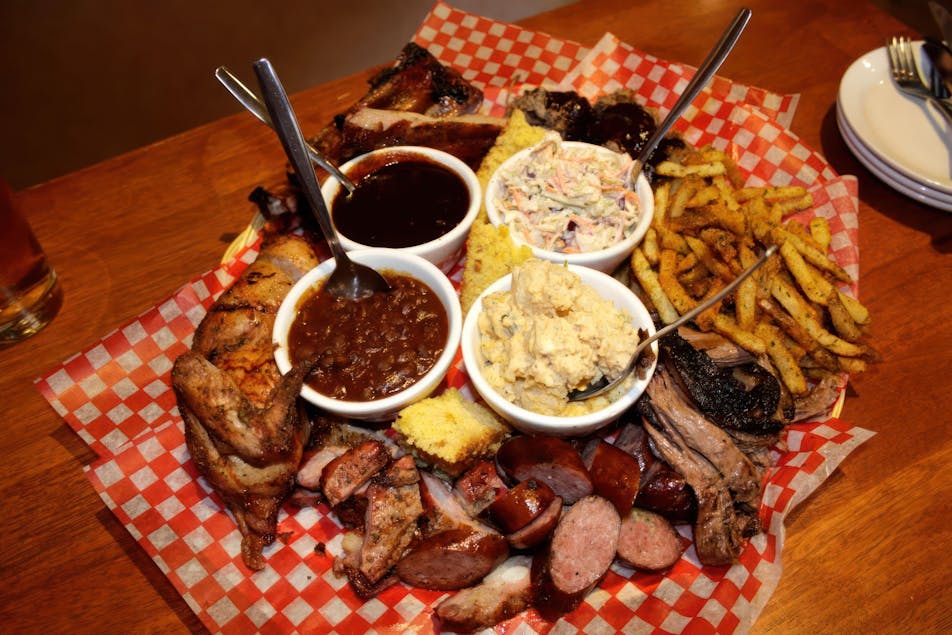 BBQ half chicken, smoked sausage, brisket, fries, ribs, additional BBQ sauce, BBQ brown beans, potato salad, coleslaw, and cornbread 😋