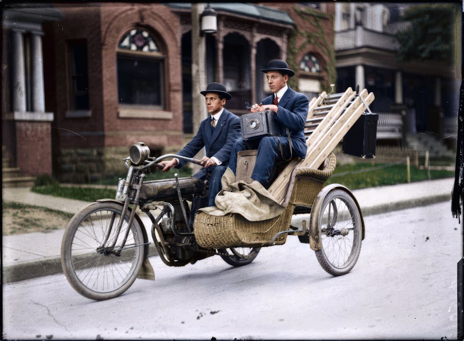 Unless your camera and associated gear weighs 50 pounds... you travel via motorcycle... and require 3 stepladders to complete an assignment, you're not a real photographer 💯 1912 photograph of freelance photographers Bill and Joseph James riding a motorcycle in Toronto. Their