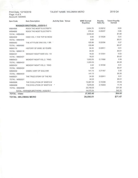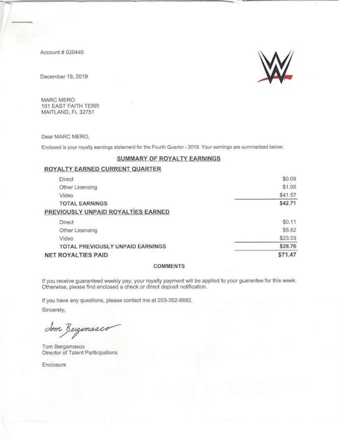 Mero shared his 2019 royalty statement to show what some wrestlers actually earn from archived WWE content. During that period, WWE generated $39,590.81 from content featuring his likeness, yet his net payout for the quarter was just $71.47. Mero emphasized that although he help