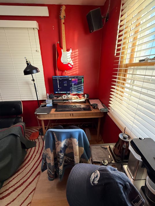 This is just in the corner of the JoeCave™. I got the desk from Scandinavian Designs, and really like it. The space is small, so I needed a small desk that still had storage. It has sliding doors below the desktop, to optimize storage space. I've got a Grovemade shelf/monitor