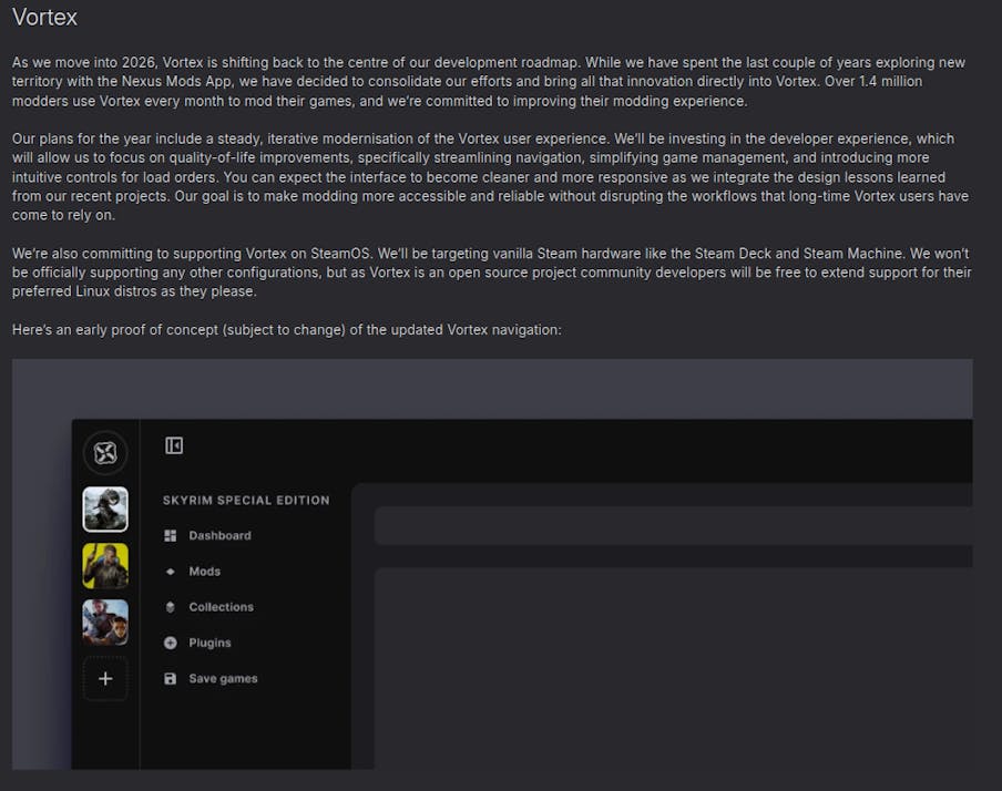 https://www.nexusmods.com/news/15433 As we move into 2026, Vortex is shifting back to the centre of our development roadmap. While we have spent the last couple of years exploring new territory with the Nexus Mods App, we have decided to consolidate our efforts and bring all that