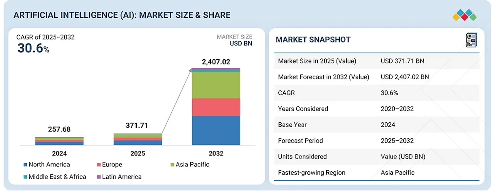 The global artificial intelligence market size was estimated at USD 371.71 billion in 2025 and is projected to reach USD 2,407.02 billion by 2032, growing at a CAGR of 30.6% from 2025 to 2032. This market growth is driven by advancements in computational power, data availabil