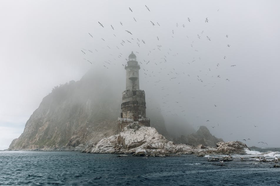 Aniva Lighthouse stands on a rocky islet off the southern coast of Sakhalin, Russia, where the Sea of Okhotsk meets the La Pérouse Strait. Built in 1939, it was designed to guide ships through foggy, dangerous waters and once operated using a diesel-powered system. The lighthouse