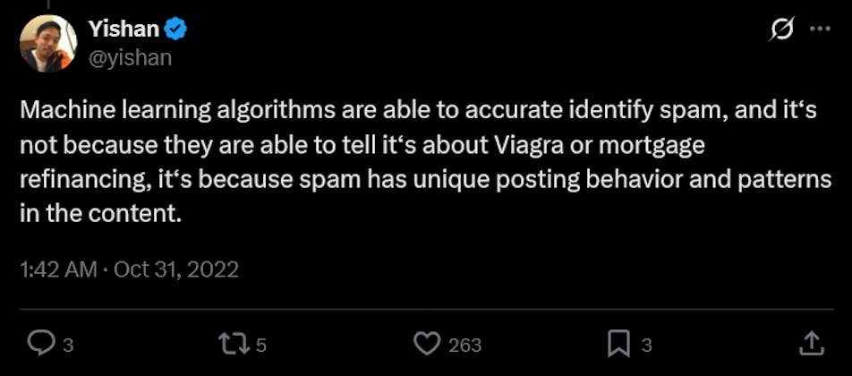 This is a Twitter thread that I share with my AI students about spam detection @forest The reality is the an LLM-backed detector are insufficient based on the current models, which hobbyist groups are researching how to jailbreak. When Anthropic released TensorTrust.Ai , we im