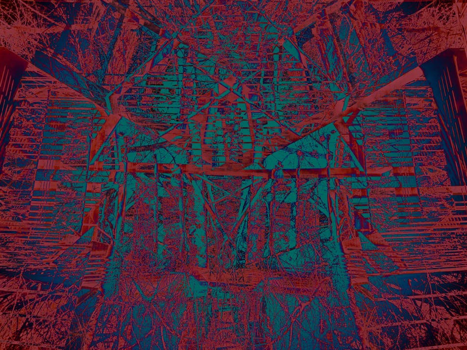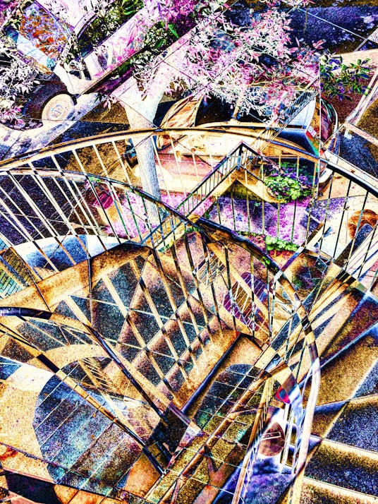 2 photographies de l'escalier de l'appartement prises en 2022, superposées et colorées le 20
