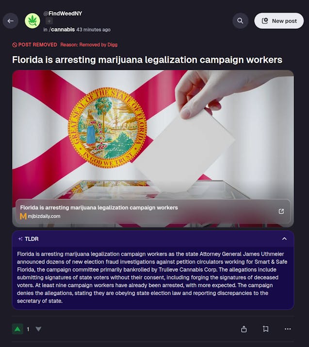 Florida is arresting marijuana legalization campaign workers as the state Attorney General James Uthmeier announced dozens of new election fraud investigations against petition circulators working for Smart & Safe Florida, the campaign committee primarily bankrolled by Trulieve Cannabis Corp. The allegations include submitting signatures of state voters without their consent, including forging the signatures of deceased voters. At least nine campaign workers have already been arrested, with more expected. The campaign denies the allegations, stating they are obeying state election law and reporting discrepancies to the secretary of state.