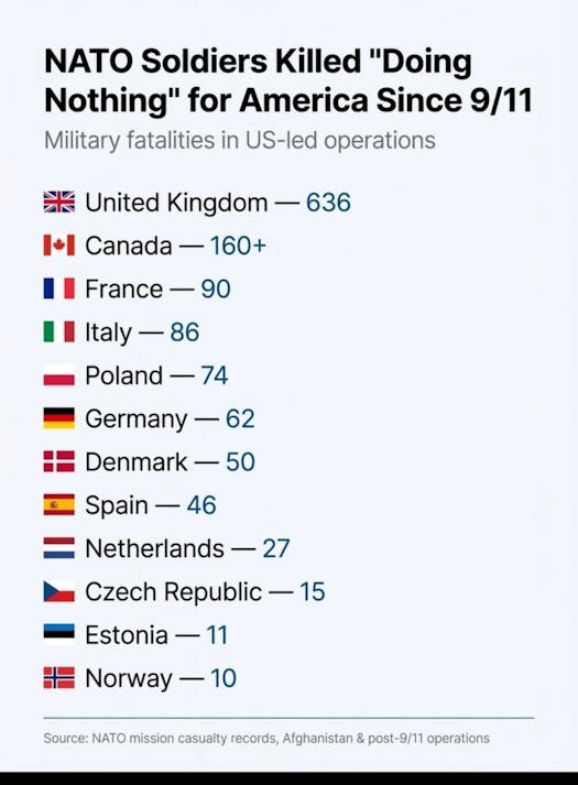 Military fatalities in US-led operations - 🇬🇧 United Kingdom - 636 - 🇨🇦 Canada - 160+ - 🇫🇷 France - 90 - 🇮🇹 Italy - 86 - 🇵🇱 Poland - 74 - 🇩🇪 Germany - 62 - 🇩🇰 Denmark - 50 - 🇪🇸 Spain - 46 - 🇳🇱 Netherlands - 27 - 🇨🇿 Czech Republic -