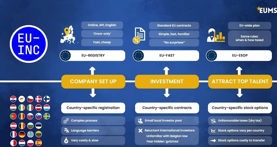 To do business across the EU today, companies typically need 27 local setups—each with its own laws. EU-INC changes that: one company, one hiring rulebook, and one investment regime. Simple set of uniform rules, across the EU. Register an EU-inc company within 48h, fully onl