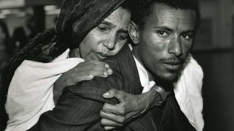 An Ethiopian Jewish man carries his mother on his back as they enter Israel as part of Operation Solomon, 1991.