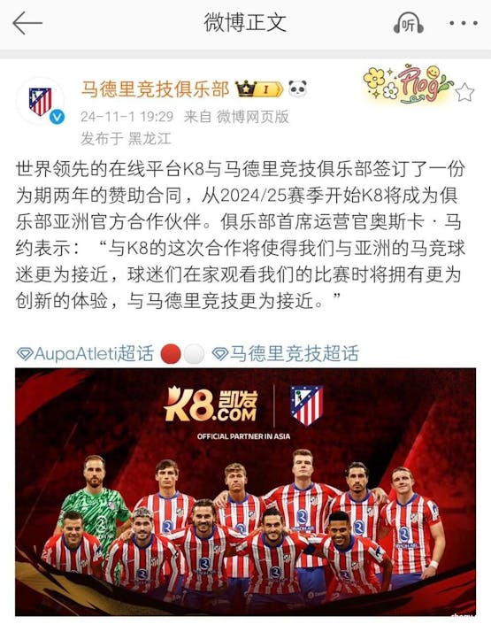 凯发娱乐成为马竞官方赞助商,马竞官方微博发布合作信息。