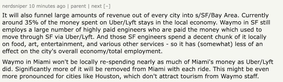 Interesting Hacker News comment that Waymo fares basically pull the money out of the local city